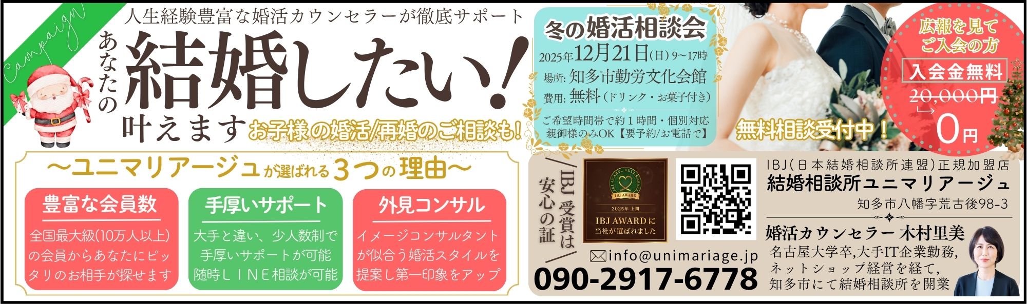 愛知県知多市を拠点に「1人でも多く結婚して幸せをつかんでほしい」と婚活を応援をしているユニマリアージュ木村里美です。