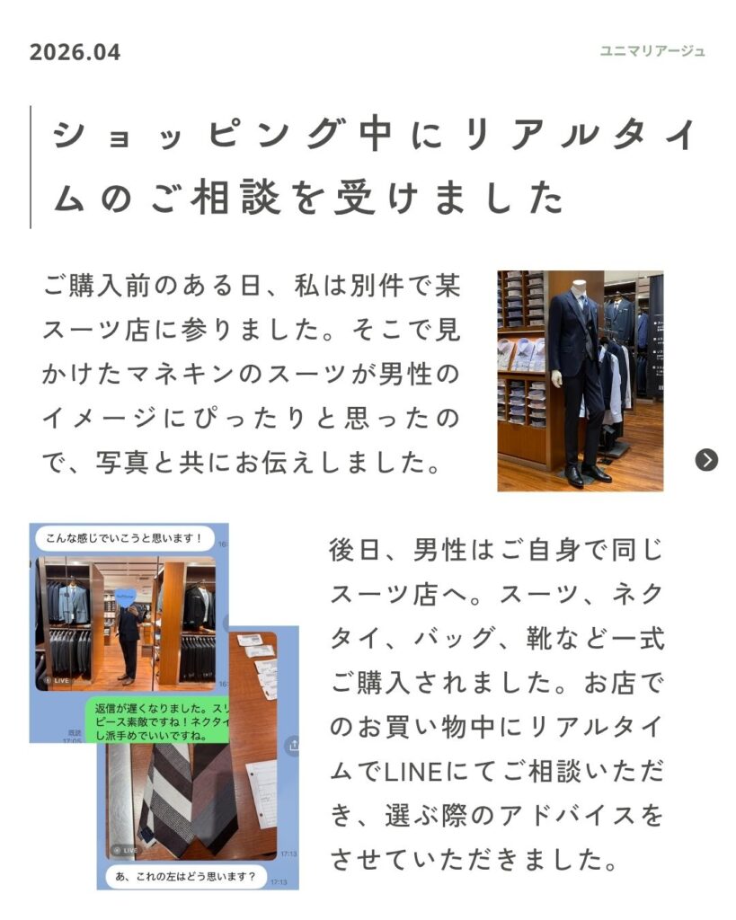 お店でのお買い物中にリアルタイムでLINEにてご相談いただき、選ぶ際のアドバイスをさせていただきました。