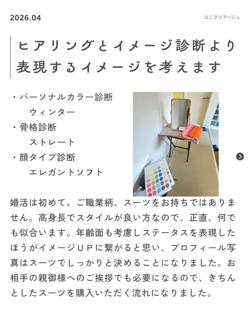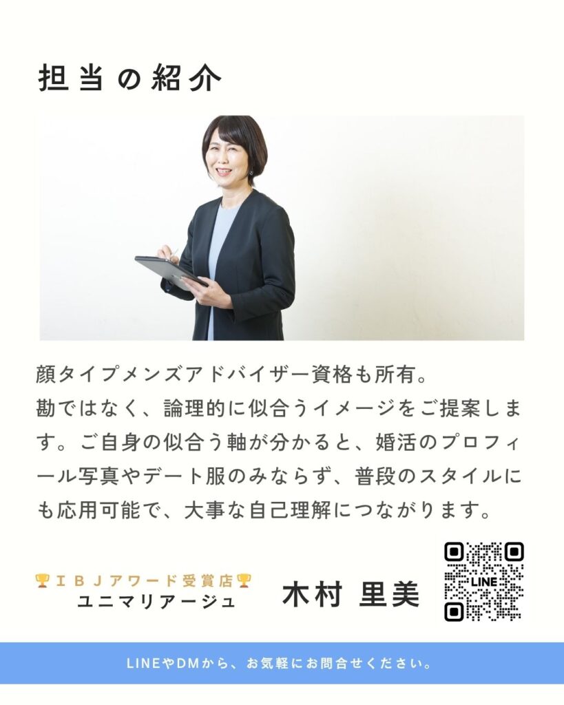 そして、ご自身の似合う軸が分かると、婚活のプロフィール写真やデート服のみならず、