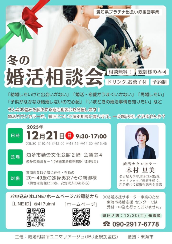 世の中がクリスマス一色になる12月末ですが、ユニマリアージュでは、婚活者のお悩みを解きほぐす、そんな相談会を行いたいと思います。